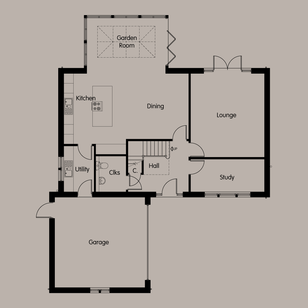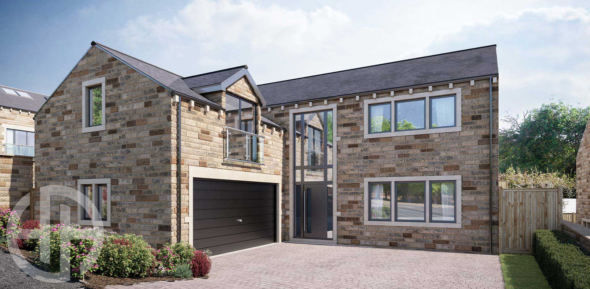 A large detached family house with integrated double garage set in a generous plot. Step into the breathtaking entrance hall, lit by a full-height glazed atrium, highlighting the feature ash and glass staircase. The heart of the ground floor, the large open plan living kitchen features fully integrated drinks area and island unit and leads seamlessly to the glazed Garden Room, with views out through the bi-fold doors to the expansive garden and fields beyond. The spacious lounge enjoys the view through the French doors leading out onto the shared patio. Further space is provided downstairs with a useful dedicated Study and the practicality of a large utility room, W.C and understairs cupboard.