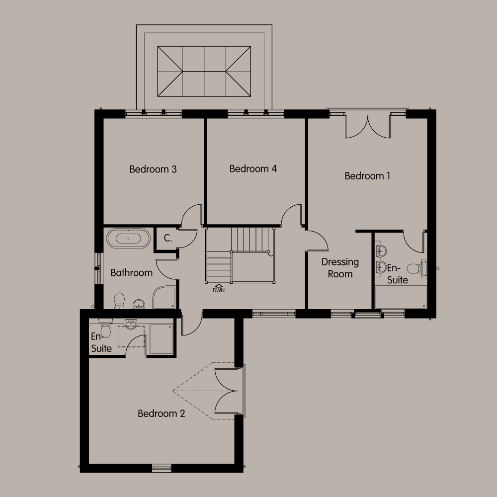 Upon entering the first floor, the feature staircase takes centre stage again with an elegant gallery providing access to 4 spacious double bedrooms and 3 luxury bathrooms. The Master Bedroom benefits from a large dressing room, stunning en-suite with double vanity and walk-in shower, while the Juliet balcony affords breath-taking views over the Magdale Valley, all from the comfort of the master bed.